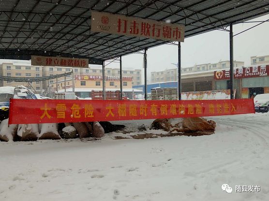 大雪期间,草店镇政府拉醒目横幅提醒老百姓远离因积雪变得危险的交易大棚,确保人民人身财产安全。 草店镇政府供图