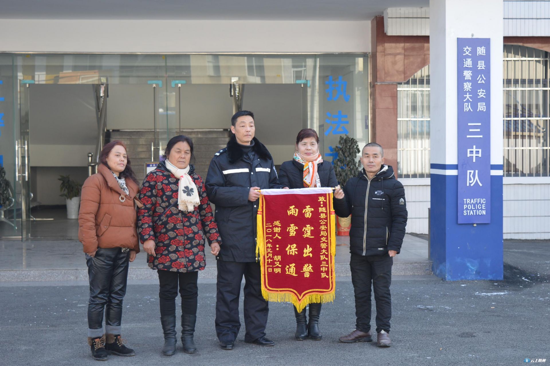 1月11日上午,胡全阳老人的子女及其亲友敲锣打鼓地分别来到随县公安局唐县镇派出所和交警大队三中队,将两面分别写着“心系百姓,扶危救困”、“雷霆出警,雨雪保通”的大红锦旗送到派出所民警和三中队民警手中,以表达民警帮其找到父亲,挽救其父亲生命的感激之情。