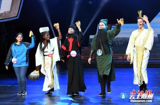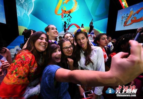 资料图:各国学习汉语的学生上在舞台自拍合影。 中新社记者 李进红 摄