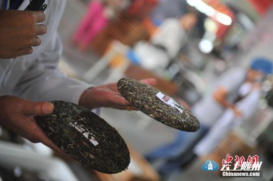 工作人员展示压好的普洱茶茶饼。中新社记者 刘冉阳 摄