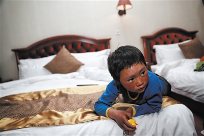 昨日,“冰花男孩”王福满在入住的宾馆房间内接受新京报记者采访。