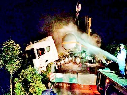 接警后,随县交警二中队民警立即赶赴现场处置,由于所载危化品环己烷易燃易爆有毒,且现场500米范围内有一新农村,距新阳店街道不到1公里,如泄漏发生爆燃,后果不堪设想。现场处置人员立即对现场2公里外道路采取临时交通管制,紧急封锁中心现场,疏散周边群众,并及时向县、市两级指挥中心汇报,第一时间协调消防、道路施救、安监、环保、路政等部门赶赴现场协同处置。