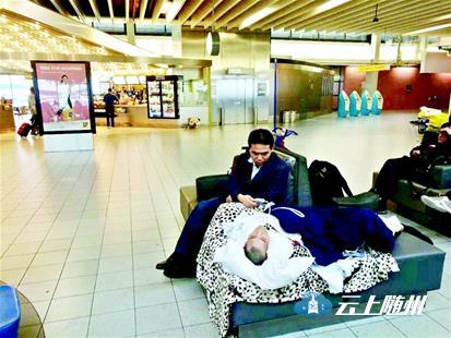 图为:鲁军体在荷兰阿姆斯特丹机场候机厅照顾熊富兴