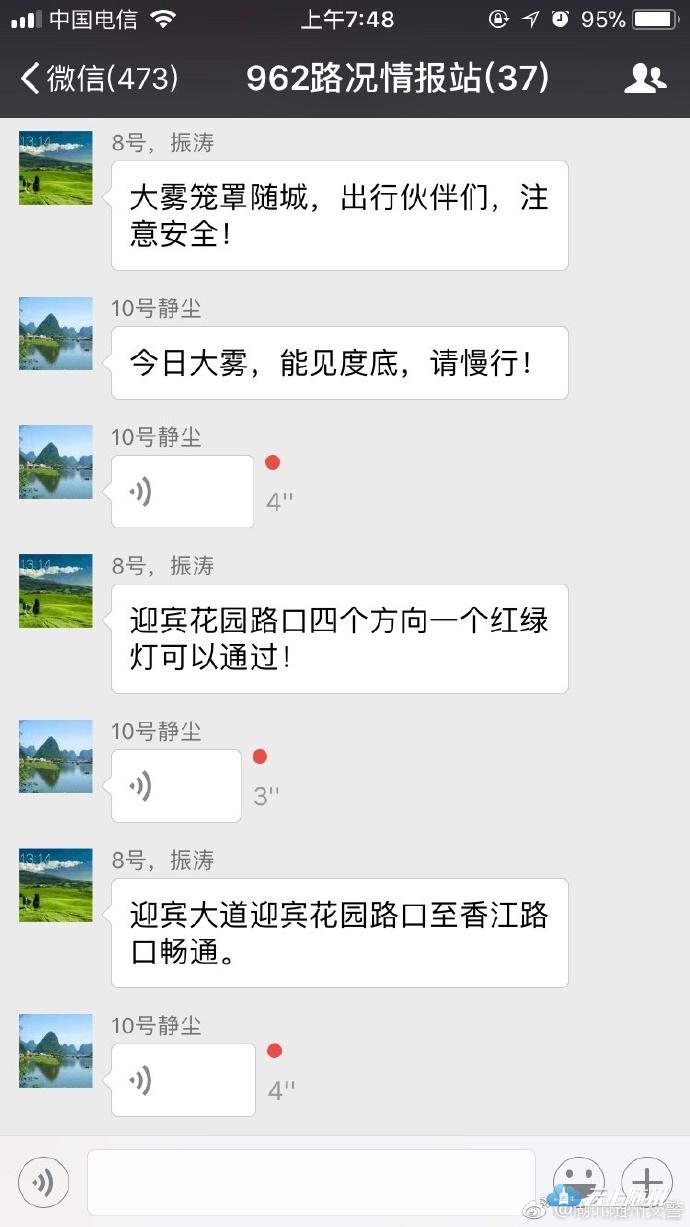 大雾,有霾,能见度低,部分路段能见度不足50米。小编提醒提醒:年老体弱者,心血管及呼吸道疾病患者以及幼儿应减少外出,避免发生意外或病情加重;不要在雾中进行体育锻炼,如跑步等,更不要在雾中作剧烈运动;雾天路面湿滑,骑自行车要减速慢行,驾车须打开防雾灯,与前车保持足够的制动距离,减速慢行,平安出行!