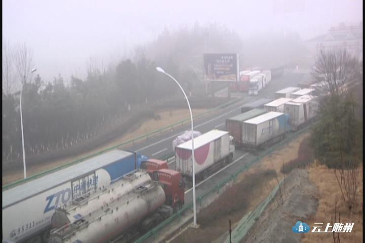 从上周开始,一轮大雾天气接连来袭,途经我市的多条高速公路也相应地实施了交通管制。昨天夜间至今天上午,大雾模式继续开启,那么高速公路上又是什么情况呢?上午九点半,记者来到福银高速随州收费站,只见百余台等着上高速的车辆从站前一直排到了连接线上。其中,排在队伍最前面的是一些物流公司的物流车。司机们介绍,他们是从襄阳、十堰方向过来的,准备前往武汉,昨晚降下大雾后,就被分流了下来,等待大雾散去,重新上高速。