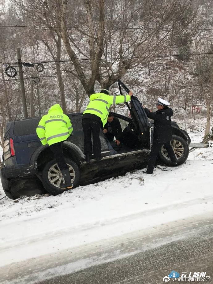 【雪是正经雪,行车要谨慎】 腊八腊八冻掉下巴,大雪如期而至,交警蜀黍怕它乱来,已启动紧急应急响应,巡逻、疏导、管控!13时许,@随县交警大队 民警在212省道王子城路段巡逻途中发现一辆越野车侧翻,车身卡在路边树旁随时会整车翻倒,司机困在驾驶室无法动弹,民警上前合力救出惊魂未定的司机!#交警提示# 暴雪说来就来, 雪天行车易侧滑,行车及时安装防滑链!