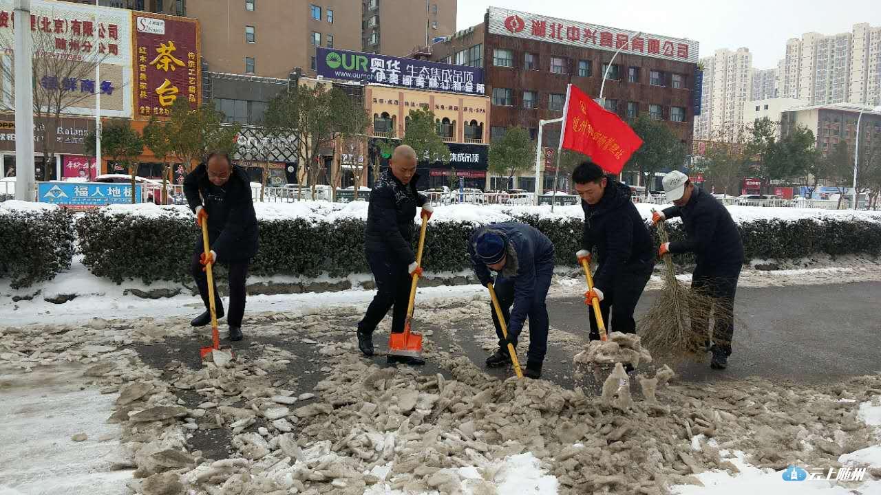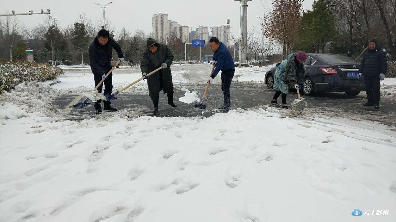 在迎宾大道乐都旋风雕塑处,市住建委30多名机关干部挥锹铲雪。不多时,四个渠化路口人行道上的积雪全部铲除干净。