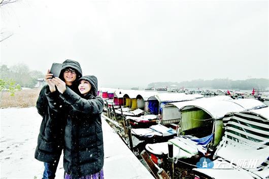 图为:游客在东湖绿道的美丽雪景中自拍