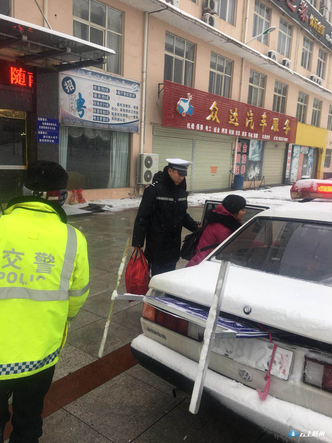 协警张志伟考虑到路途遥远,便主动做工作,让她们先住下来。于是,他让车上的母女和另外两名妇女下车坐上警车,并向司机提供了最近的修车场的电话,让其联系修车,并提醒注意现场安全。随后,张志伟驾驶警车把受困受冻的母女等送往十多公里的洪山镇,安排她们住进了旅店。这时,年轻的妈妈脸上转愁为笑,“谢谢警察同志对我们热情的帮助!”