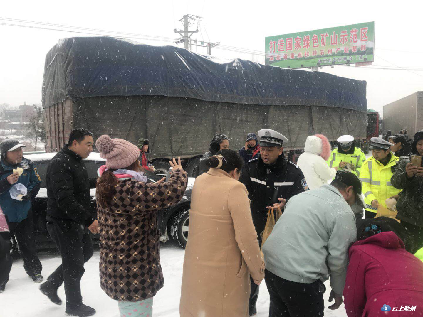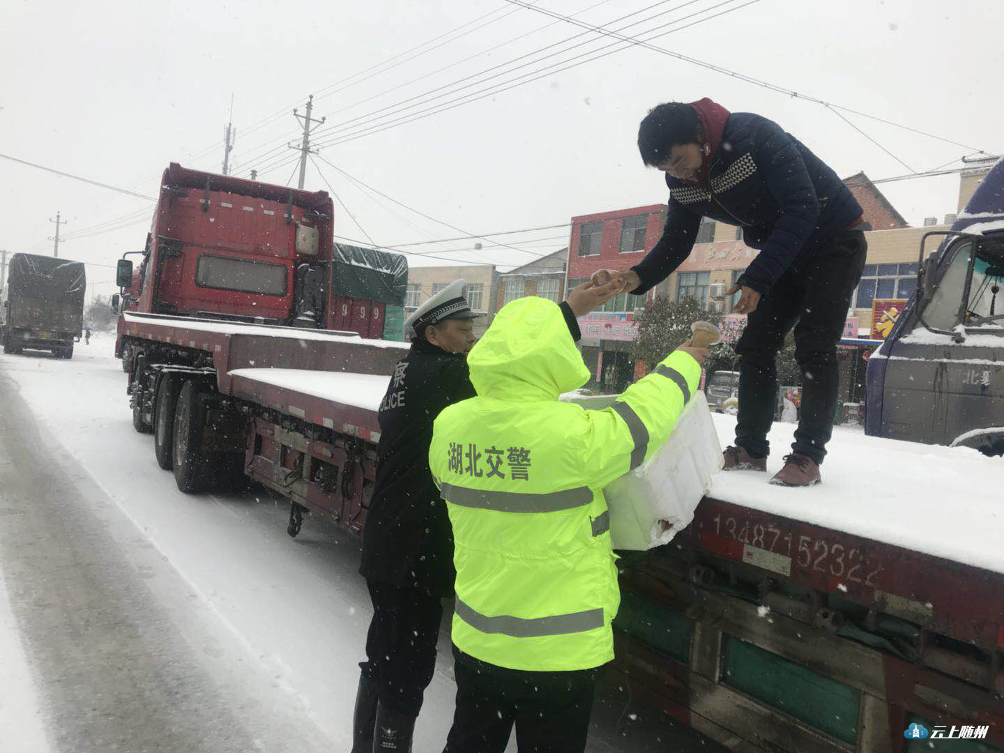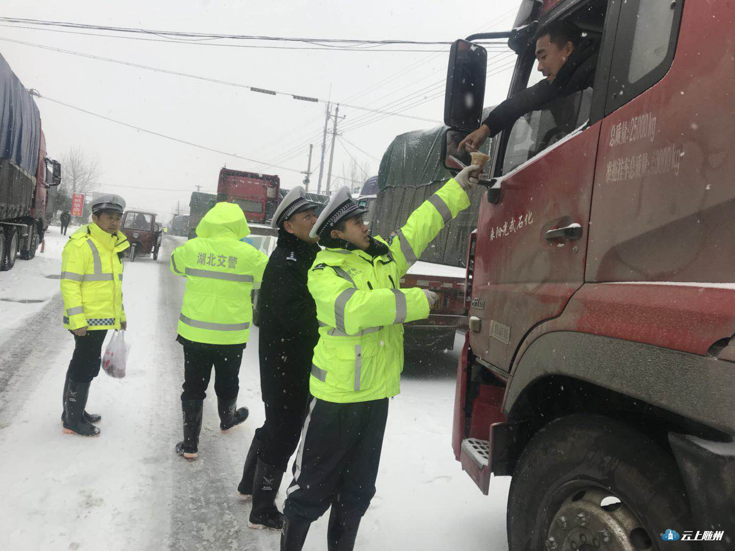 情满雪道暖民心。大雪还在下,民警依然在路上。据随县公安局交警大队最新数据统计,截至1月25日下午,交警大队民警、协警共救助车辆216辆,其中事故车辆42辆,救助交通事故受伤人员16人,没有发生一起重大交通事故。从昨晚到今日中午,各中队民警免费为滞留司机、群众发放食品86份(件)。副大队长兼事故中队长周兵25日一大早驱车到厉山镇街上买回两箱面包、油条等食物,送到十多里外的净明路段,为司乘人员发放。一位上海籍驾驶人感动地说,“我们虽然在异地遇到了大雪,但我们没有顾虑,随县交警让我们感受到了亲人般的温暖。”