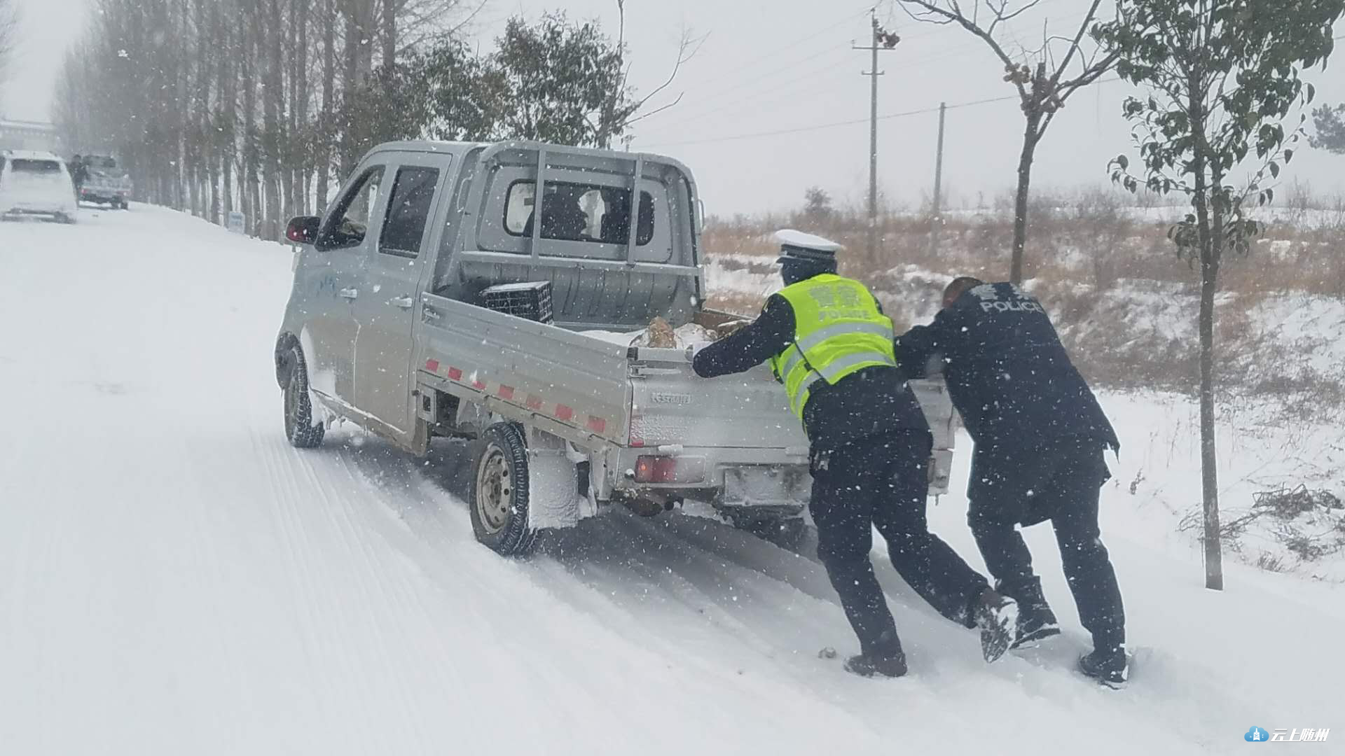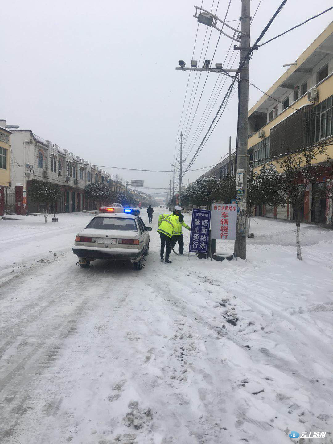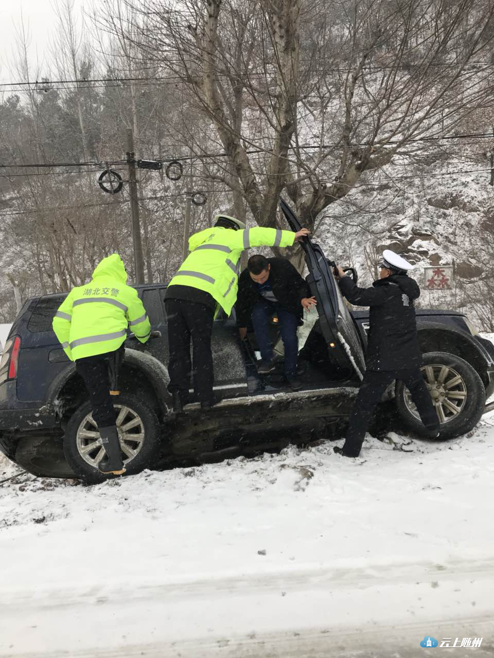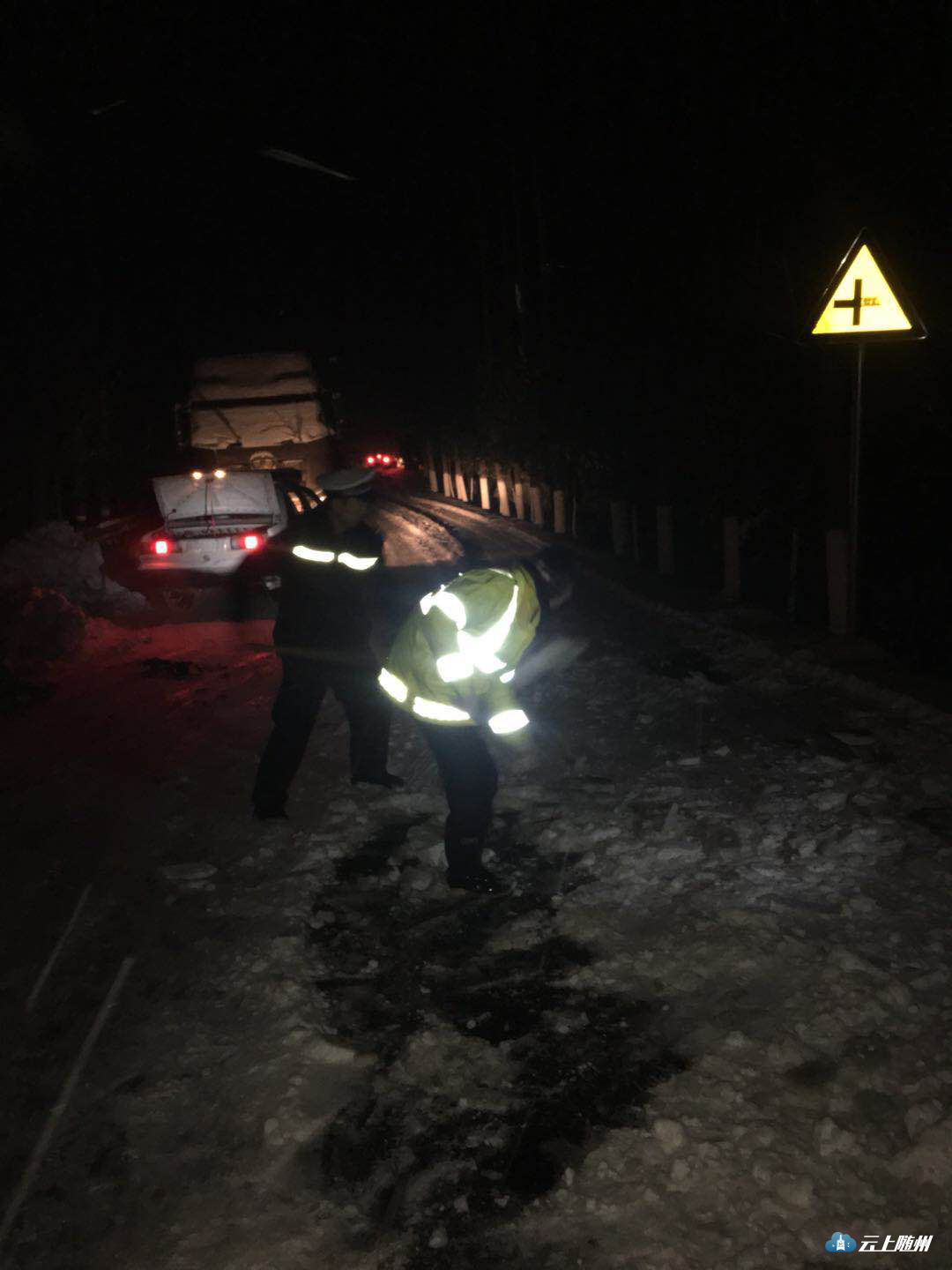 “雪道”忙碌的身影。25日晨,大雪还在飘飘落落,316国道上已经被积雪覆盖,一中队中队长郭华驾驶着警车在国道上巡逻,他不时用话筒提醒过往车辆“减速慢行”。在三道河路段,因拆桥导致便道车辆通行缓慢,有民警在冒雪指挥,并时不时帮助推车。在该路段两端,大型车辆分流禁行。二中队辖区以山区为主,中队紧盯桥梁、涵洞、急弯、陡坡等易积雪路段,通过设置“大雪天气,限速30”、“道路结冰、减速慢行”等临时性提示牌,重点引导驾驶人按照恶劣天气条件下降速通行。目前,306省道环潭大上坡、郧阳大上坡,216省道有车辆滞留,民警正在副大队长王家志、中队长瞿联伏的带领下,采取撒盐融冰或启动铲车作业,清除坡道积雪。据悉,大洪山、温泉等旅游景区道路已经全部封闭。三中队是管理国道最长的中队,316国道29公里,其中弯急坡陡的“魔鬼路段”就在其中。25日凌晨,净明路段出现了拥堵,副教导员唐德勇、中队长齐燕峰带领民警协警采取撒盐融冰,用铁锹铲雪等办法紧急疏堵。随后,教导员刘昌儒带领民警增援,经过近一个小时的努力,让道路恢复了通行。212省道黄土坡路段冰雪天容易堵车,四中队中队长贺勇带领民警一直没离开过,他说,“从昨天下午到今天中午,该路段反反复复堵了四、五次,我们撒盐、铲冰一直在行动,我们用手推车,救助的小车不下50辆。”他边说着,边卷起被冰雪泥土弄脏的裤腿。驻守随北门户的五中队,抗雪保畅压力也不小。随北比随南的气温要低两度左右,312国道穿境而过,在第一轮暴雪考验时,这里的疏堵任务十分艰巨。所以这次在人员安排上交警大队充实了警力,办公室主任戴玉平包保该中队,他与中队长王玮主动向沿线的淮河、小林镇党委政府汇报工作,到得了党委政府人力、机械的支持。在大雪来临时,中队民警在当地派出所民警、路政等部门的大力协助下,依靠社会力量合力抗灾保畅,大大降低了抗灾难度。五中队还积极应对高速封闭分流车辆的管控,对长途客运、危险品运输等重点车辆,劝其到就近的酒店、停车场停车休息,或采取警车带路护送出境。