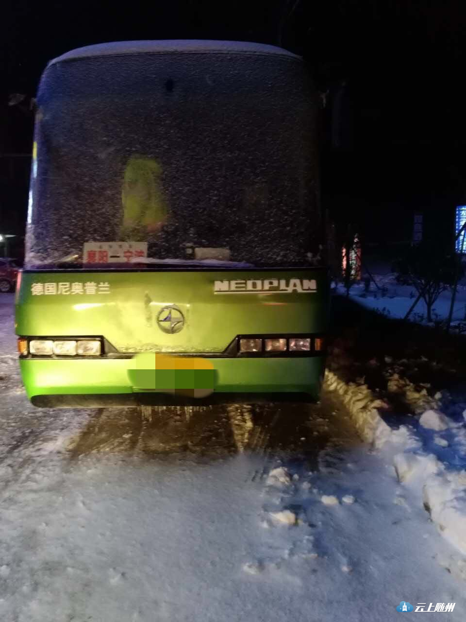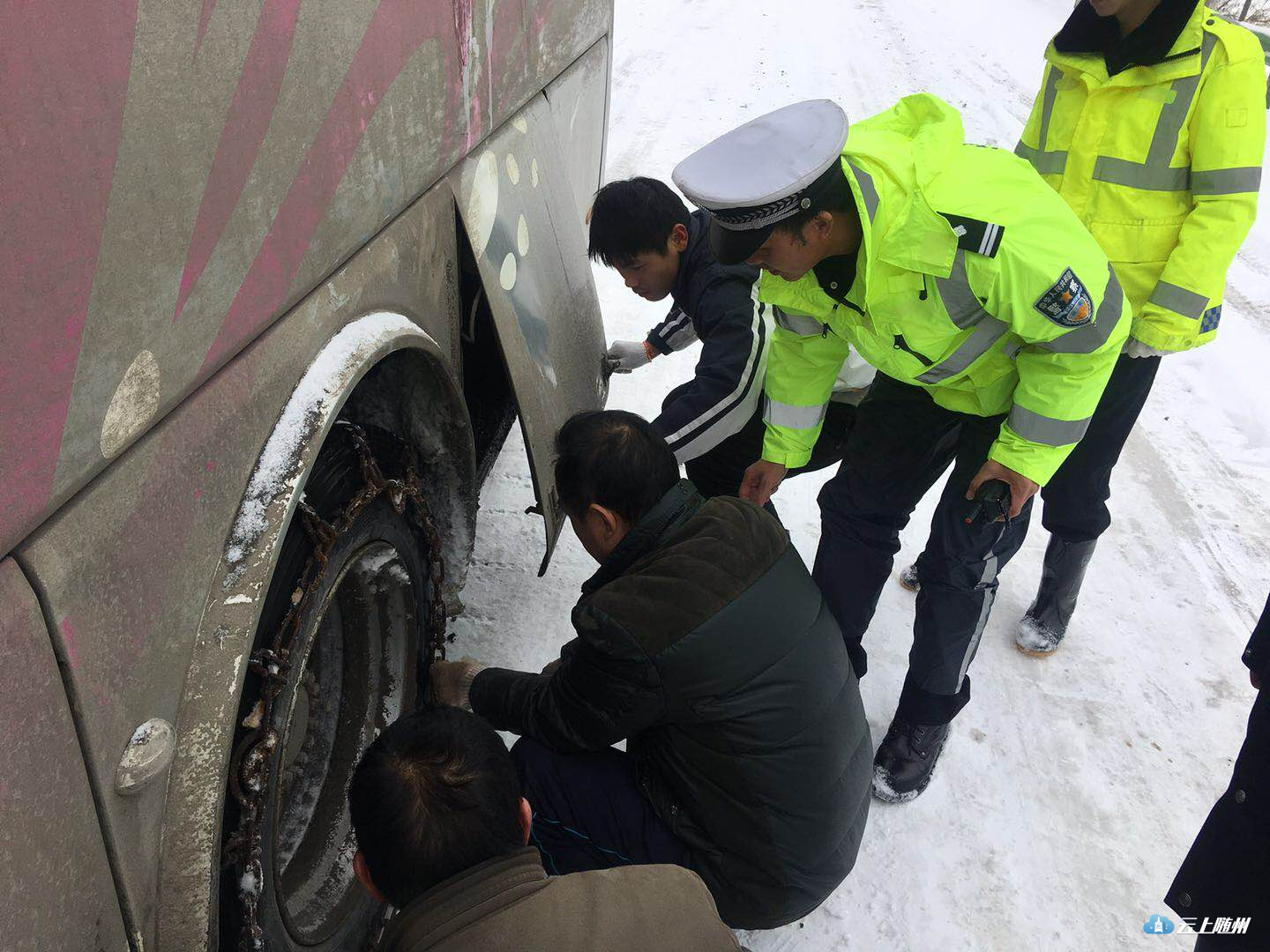 1月26日早晨8时许,随县公安局交警二中队民警也把一辆25日晚滞留下来的外籍大客车装上防滑链,护送出境,并联系枣阳交警接送该车辆。