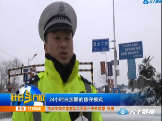 【同期声】 市公安局交警支队二大队一中队民警 张骏 执勤民警打开警灯和执法记录仪到辖区路面进行不间断巡逻,不断向上级领导发送路况视频和路况信息,配合路政和环卫部门进行铲雪除冰工作,遇到群众求助和警情随遇随处。通过高峰站岗、平峰巡逻的24小时白加黑的值守模式,保障市民安全出行,确保辖区道路不失守、不失控。