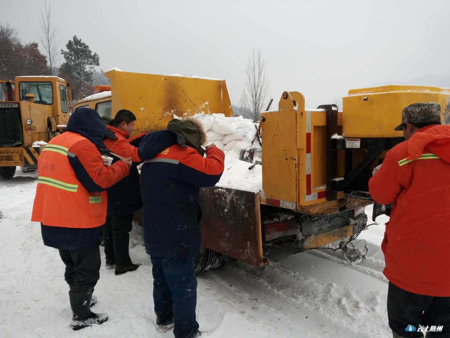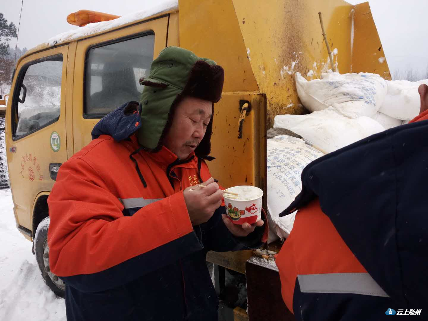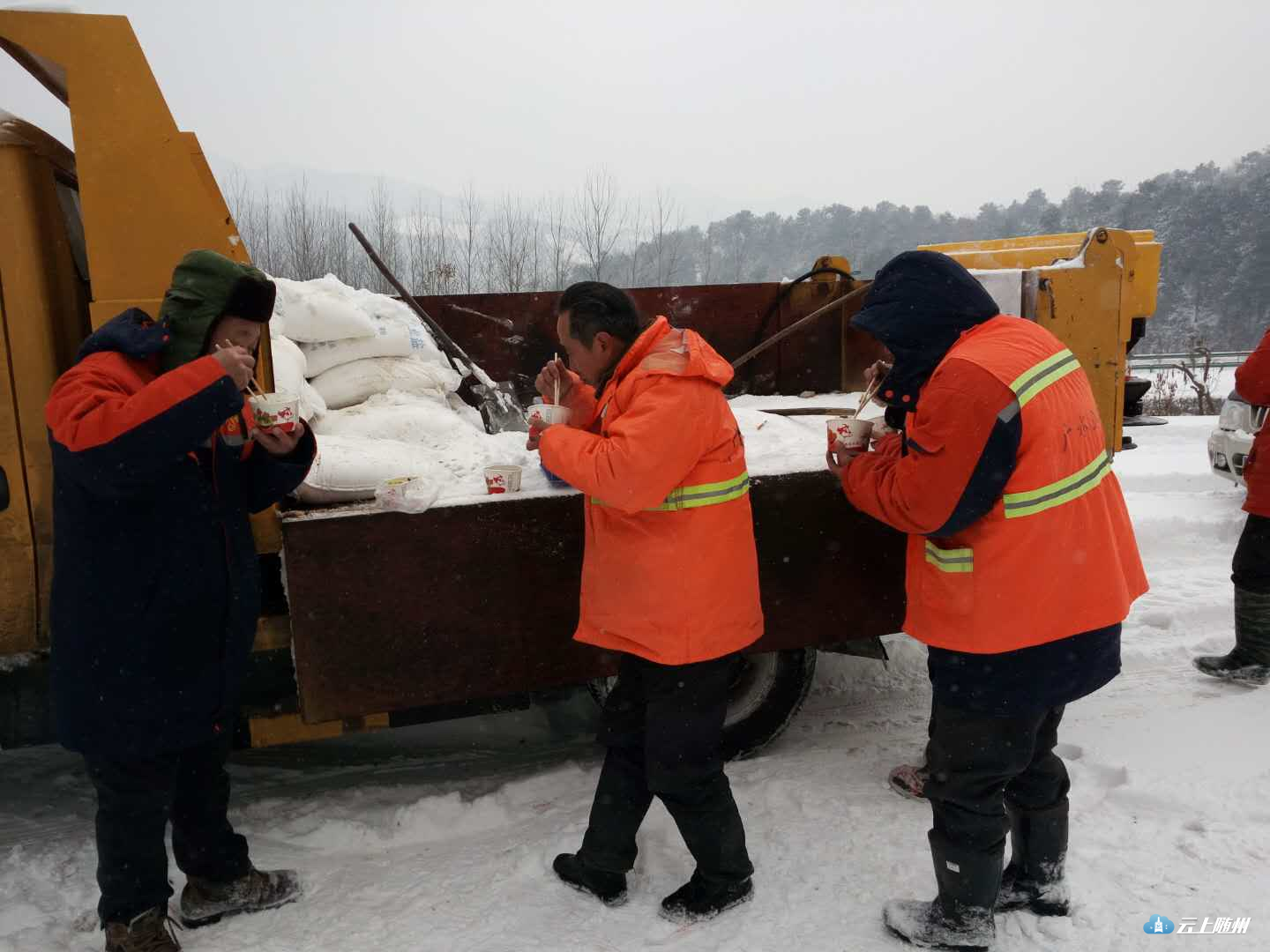 在广水平靖关,道路养护工人为确保s210省道畅通,只能在路边吃下午餐,吃完后继续他们除雪的工作。