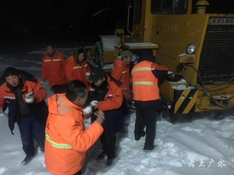 这几天,公路部门路政、养护人员全员出动,全天候坚守在S210省道平靖关等国省干道上,冒着刺骨的风雪铲雪撒盐破冰保畅。这就是奋战在除雪保畅一线的交通人,他们忍受着严寒,在漫天大雪中简单就餐,为的是争取更多时间返回路面除雪保畅。