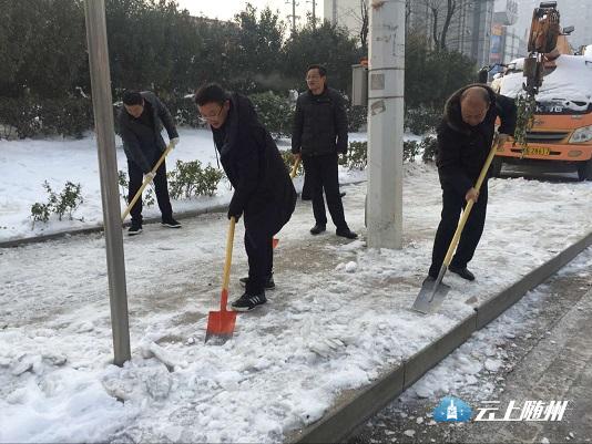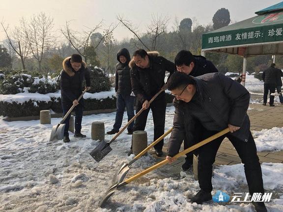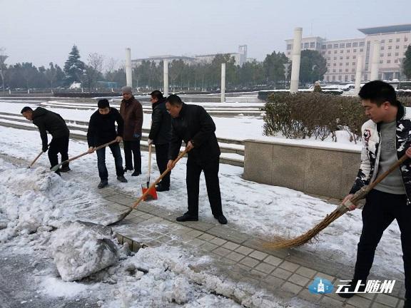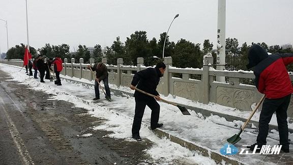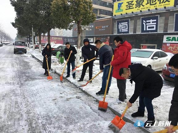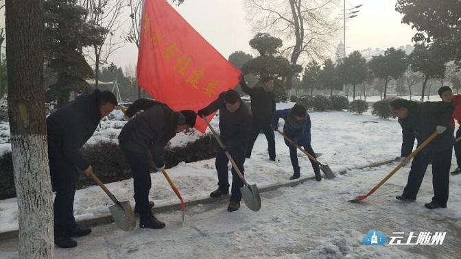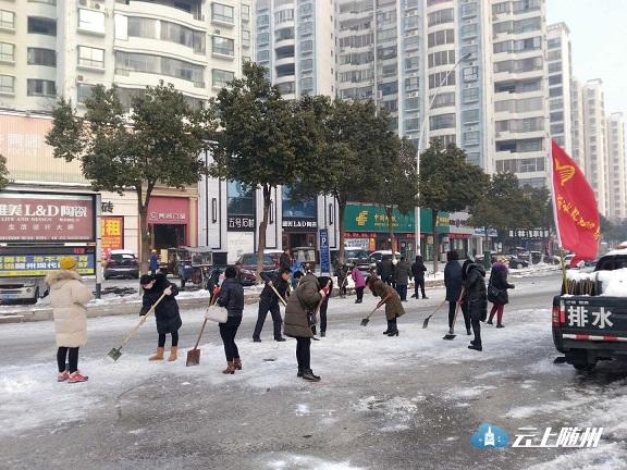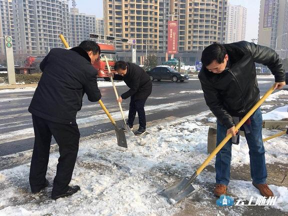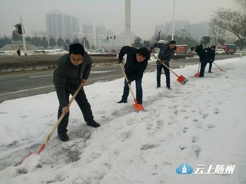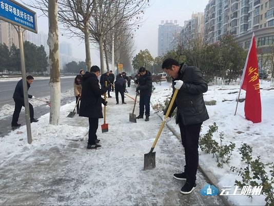 图为:市园林系统干部职工在季梁大道铲冰。