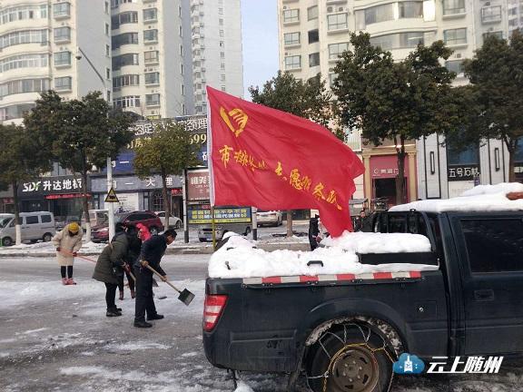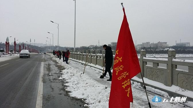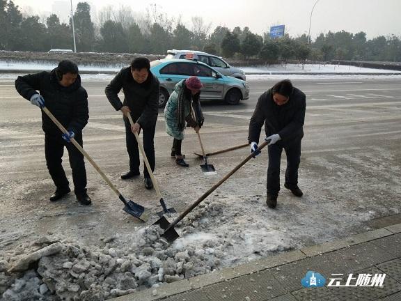 图为:市质安站干部职工在市工商局至编钟大桥头人行道铲冰。