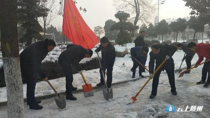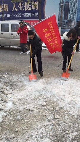 图为:市“三办”干部职工在乐都旋风至市审计局北端人行道上铲冰。
