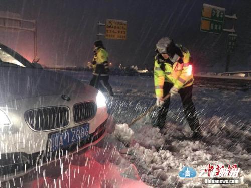 资料图:雅西高速路段交警雪中帮助受困车辆脱险。