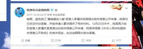杭州市公安消防局官微12月26日发布消息称,将根据《中华人民共和国政府信息公开条例》的有关规定,在法定期限内做出答复。
