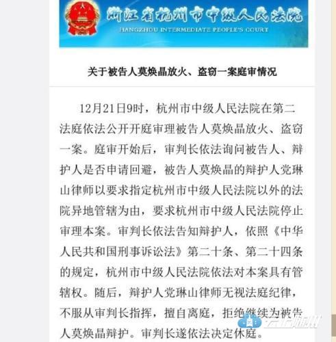 不过,2018年1月8日,杭州中院官微发布通报称:2017年12月27日,被告人莫焕晶向该院书面提出不再另行委托辩护人,由法律援助律师为其辩护。