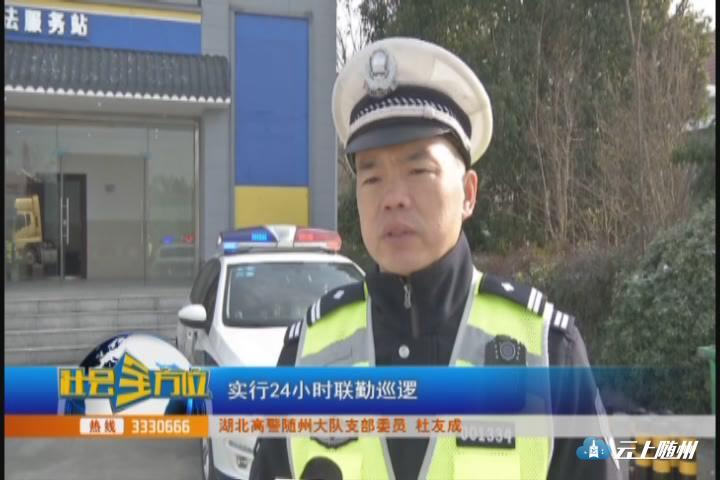 【采访】湖北高警随州大队支部委员 杜友成:在今年的春运期间,我们高速交警采取了以下几个措施,保安全,保畅通,首先我们是紧抓重点违法,重点纠违,比如说我们的酒驾。醉驾。客车超员,超速,违停等重点违法行为,第二,我们是采取警路联勤保畅通,保安全,实行24小时联勤巡逻,确保我们道路安全畅通,为广大司乘人员提供优质的服务。