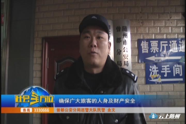 在中心客运站,记者看到治安巡逻队伍正在车站巡查,以往中心车站小偷猖獗,经常发生旅客钱财被盗的现象,今年春运,曾都区公安局加大了对中心客运站的治安维稳力度,由十名警察组成的工作专班,全天侯对中心客运站以及长途客运站进行巡逻治安监管。