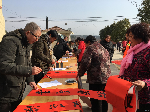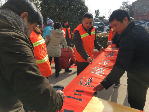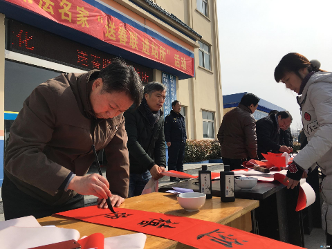 “车轮滚滚描长卷、公路条条奔小康”、“路畅人和幸福路、文明相伴新时代”、“铺就百姓幸福路、畅通交通大动脉”。送春联现场,公路干部职工纷纷拿出自创的春联请书法名家献墨宝,抒发了浓厚的岗位自豪感。家住公路管理站附近的群众则要求撰写传统的春联:“阖家欢乐迎富贵、满堂欢喜永平安”、“新春送入四季福,好运迎来八方宝”,拿到春联的群众一个个笑颜逐开。