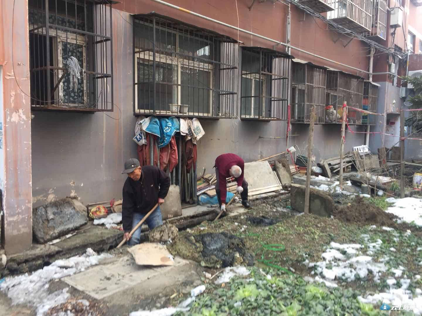 西城办事处玉波门社区组织干部职工、巡防队员、志愿者清运背街小巷垃圾、积雪,清楚牛皮癣,为辖区居民度过干净祥和新春佳节营造良好卫生环境。