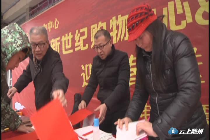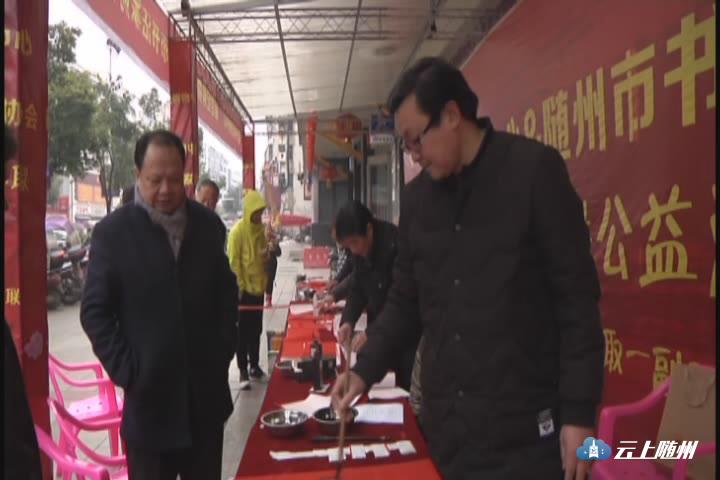 【同期声】市书法家协会副主席 刘建华 我们随州市书法协会响应湖北省书法家协会的号召,进军营,进社区,进商场,今天参加送春联活动的有20多位,我们在购物中心门前,分了两个地方,书法家在这写字,写春联送给大家。希望我们写的春联,能给新年带来喜庆的气氛。