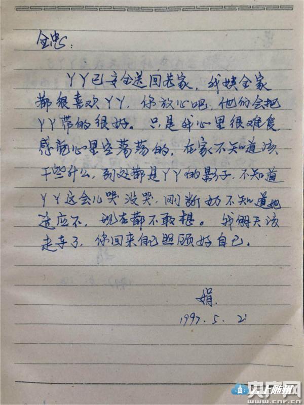“全忠,丫丫已安全送回老家,我姨全家都很喜欢丫丫,你放心吧……”1997年5月,任亚娟在笔记本上写下了给丈夫的第一篇留言。