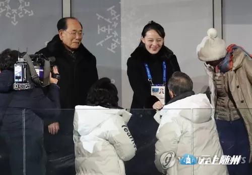 △看台上,韩国总统文在寅与金正恩妹妹金与正握手