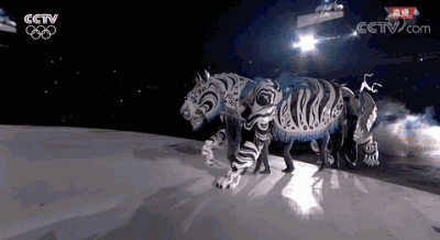 △精彩的开幕式短片引出白虎。据组委会介绍,老虎象征着朝鲜半岛的地理形状,白老虎则被认为是神圣的守护兽。同时,白老虎的“白”色象征着冰雪体育运动。