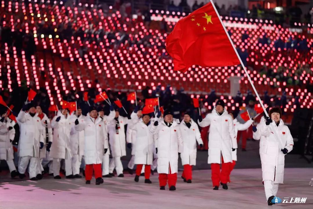 中国代表团第65位入场。旗手是短道速滑运动员周洋,第三次参加冬奥会的周洋手握3枚金牌,这也是继大杨扬之后,第二次由短道速滑运动员担任开幕式的旗手。