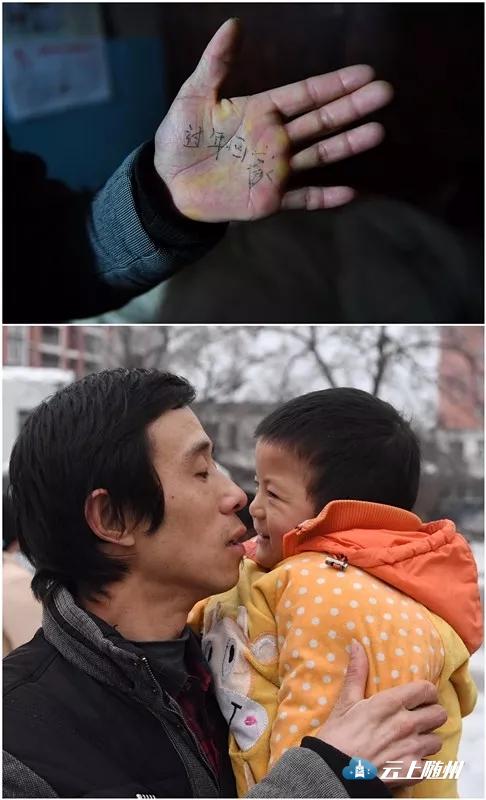 上图:2018年1月26日,回家前一天,在外打工的聋哑人段艳波在掌心写上“过年回家”几个字。家中年迈的父母以及同样聋哑的两个孩子正在等着段艳波夫妇。下图:1月27日,段艳波抱起儿子亲吻。