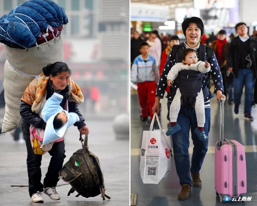 左图:2010年1月30日,一位背负着超大行李的母亲怀抱孩子在南昌火车站匆忙赶车;