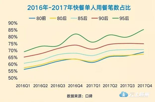 基于口碑数据,各年龄段单人用餐的消费笔数占比均呈现上升趋势,95后更为明显。