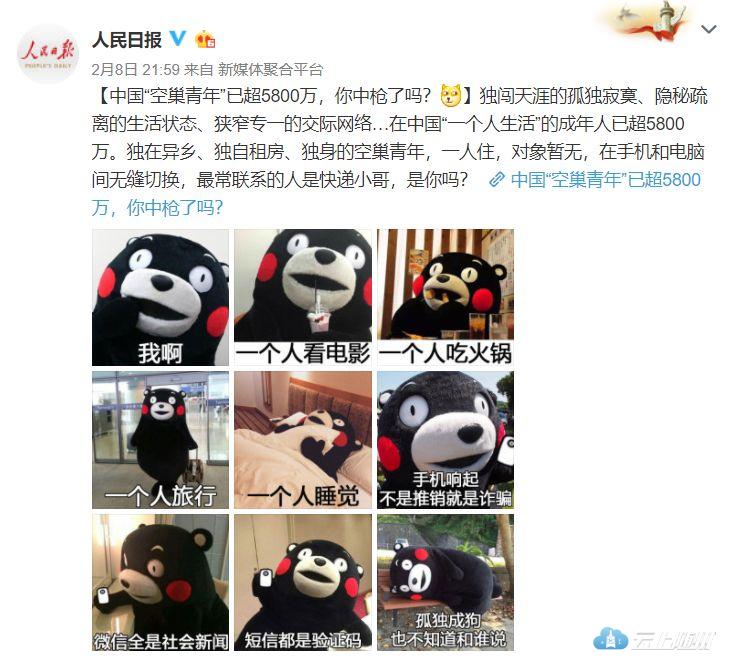 有网友这样描述一个典型的空巢青年:“在大城市工作不久,住在月租三四千的一居室,唯一熟悉的室友是喂养的宠物,厨房有全套餐具但吃饭主要靠外卖,长时间在手机和电脑之间无缝切换……”