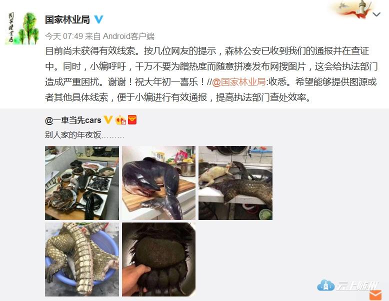 除夕夜,有网友在微博上发布一组“别人家的年夜饭”图片,图中疑有穿山甲、熊掌等保护动物。该微博被国家林业局转发,并通报了森林公安查证。然而,涉事网友今日却在微博致歉,称该图片为网上下载P的图,实际并无此事。