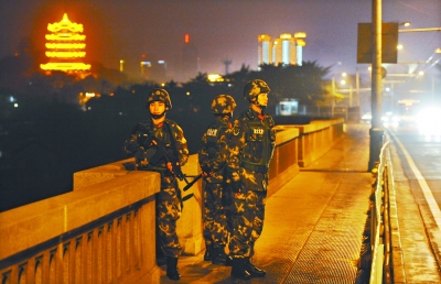 2月15日,正值农历除夕,全国都沉浸在合家团圆、辞旧迎新的欢乐气氛中。武警武汉市支队驻守武汉长江大桥的官兵们,坚守岗位、时刻警惕,守护着江城安宁和百姓幸福。(记者李子云 通讯员张志伟 朱自涛 摄)