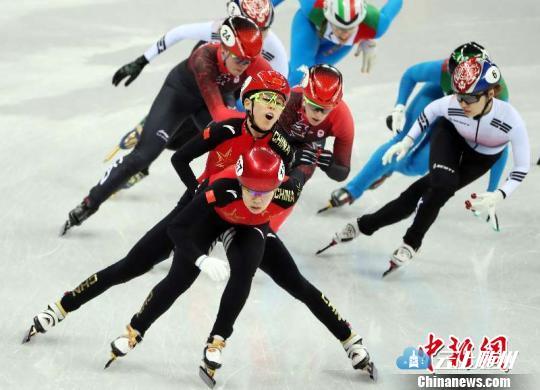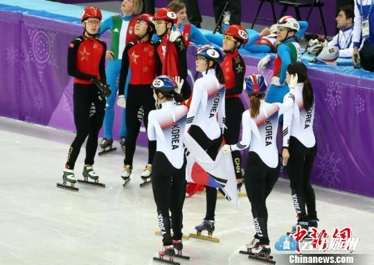 中国短道速滑队的姑娘们焦急地等待着判罚结果公布。