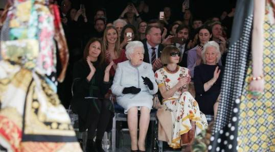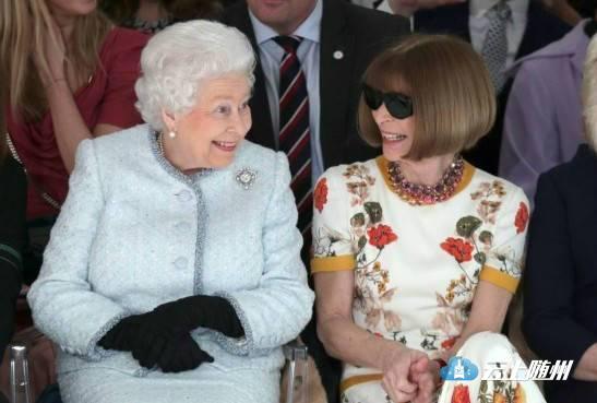 当日,女王身着浅蓝色套装,在英国时装协会主席卡罗琳·拉什的陪同下亮相,91岁的英女王观秀全程饶有兴致。