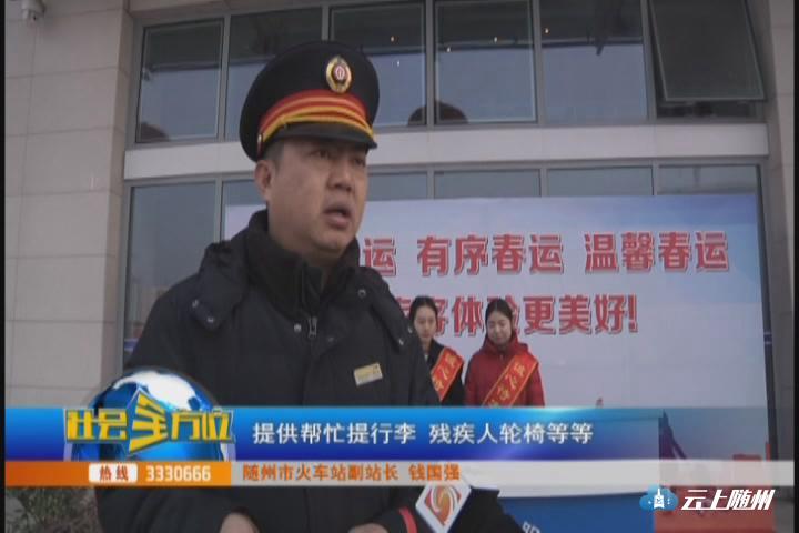 【采访】随州市火车站副站长 钱国强:服务队主要的目的就是为了让旅客出行更平安、有序,温馨,提供了一些服务,比方说,为了保障有序进站,避免无票旅客进站,提供爱心卡,送一些重点旅客进站,提供帮忙提行李,残疾人轮椅等等,包括我们服务台提供的有药品,针线包,包装袋,剪刀等等一系列的小物品,为旅客的出行提供一些必要的帮助。