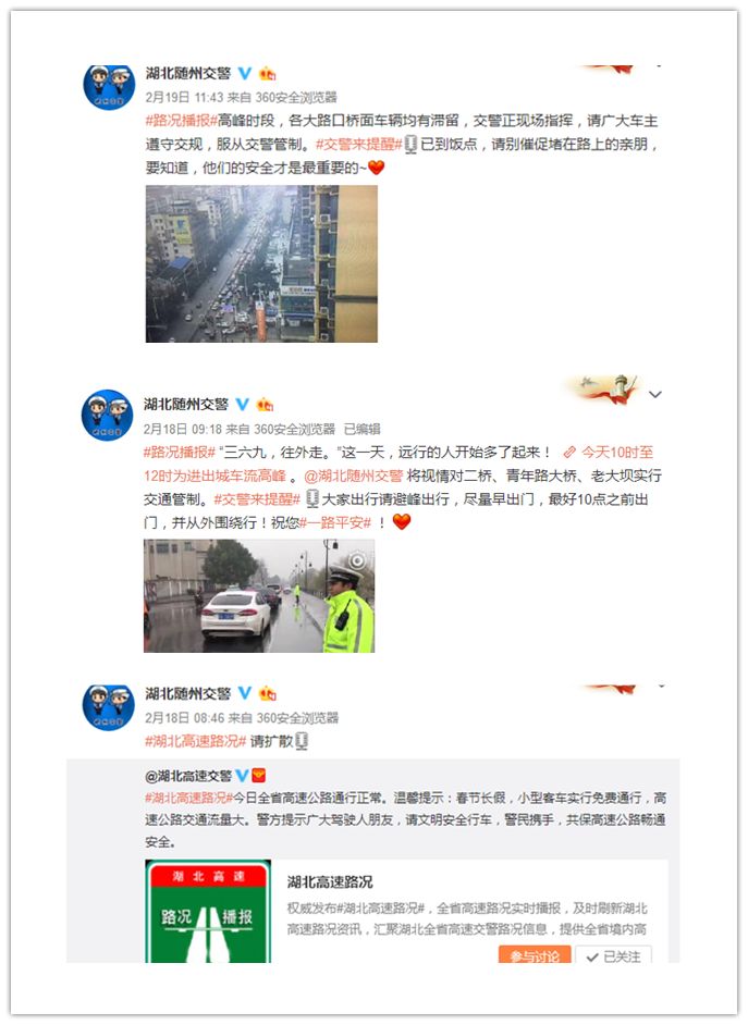 春节期间,随州交警以“防事故、保安全、保畅通”为目标,面对节前及节日期间超大人流、交通流,全员上阵,坚守岗位,严密管控,全面拉紧交通安全防线。节日期间,未发生长时间、长距离交通拥堵,未发生执法管理问题,未发生负面舆情,为全市市民安度春节创造了良好的道路交通安全环境。