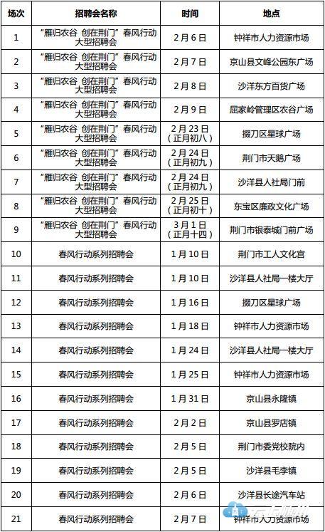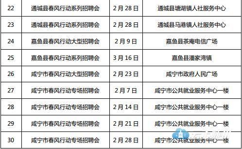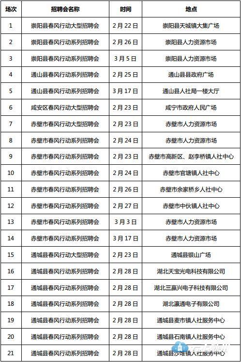 2月23日,咸宁市将在咸宁人民广场举办“春风行动”大型招聘会活动,于2月初至3月底陆续在全市范围内举办30余场招聘会,预计累计进场招聘企业1700余家次,计划提供5万余个岗位。