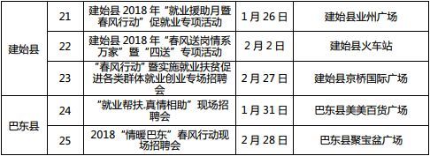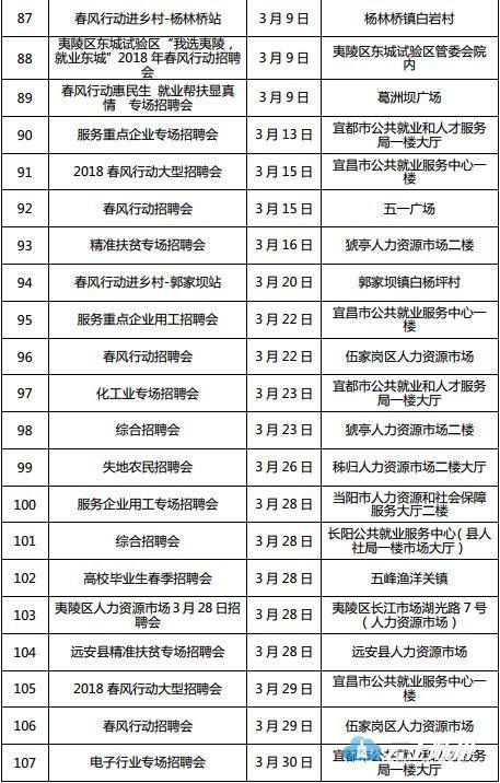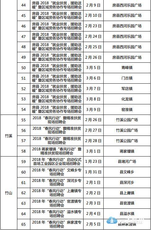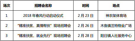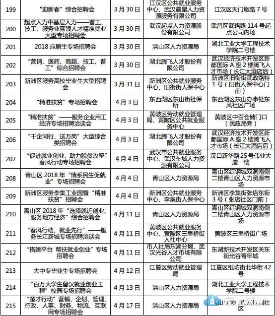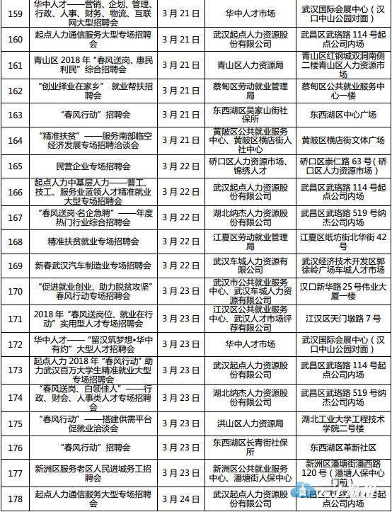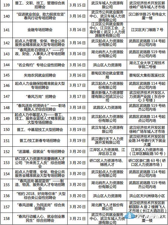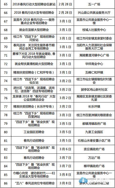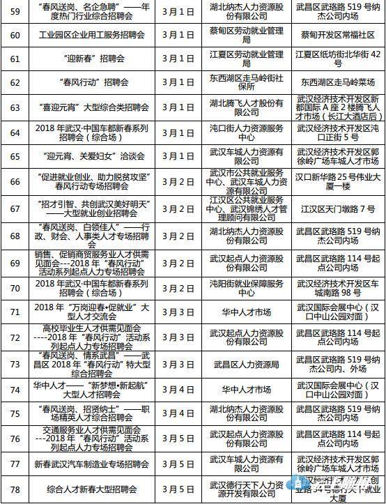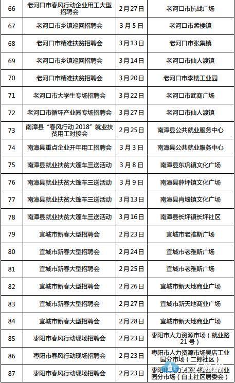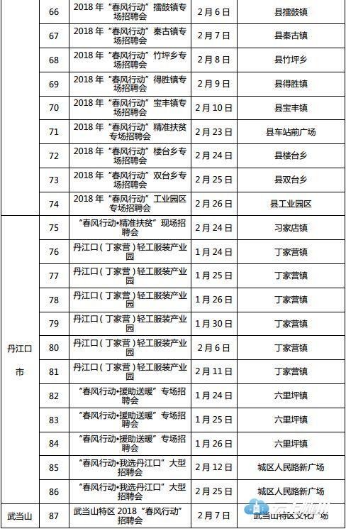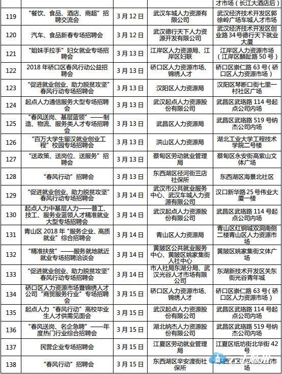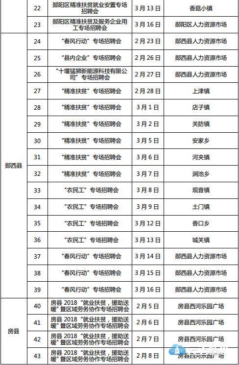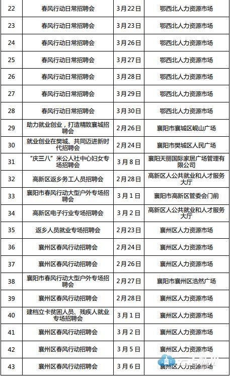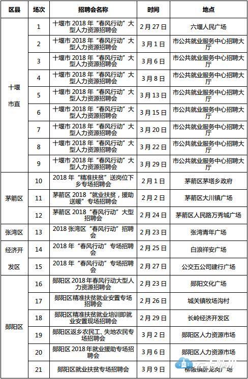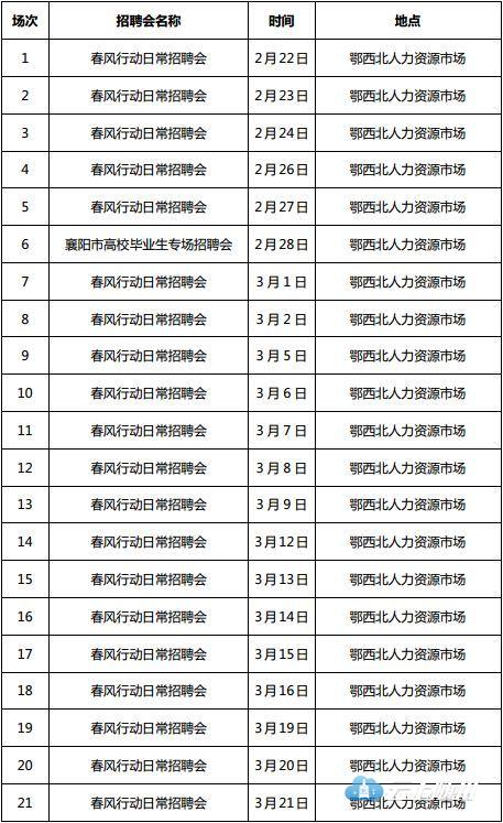 襄阳市2018年“春风行动”期间,将举办139场招聘会,提供就业岗位11.4万个。襄阳城区将连续举办5场大型招聘会。2月24日上午在樊城区人民广场,2月26日上午在襄城区岘山文化广场,2月27日上午在襄州区浩然广场,2月28日在鄂西北人力资源市场,3月1日上午在高新区管委会门前广场。