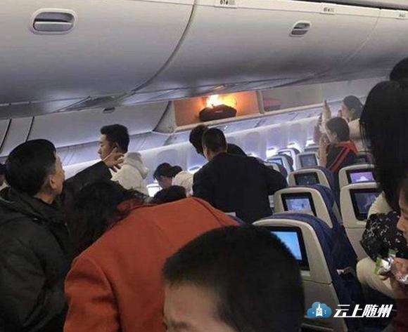 25日,南航一航班起飞前,行李架上行李起火,初查系充电宝所致。 图片来源于网络