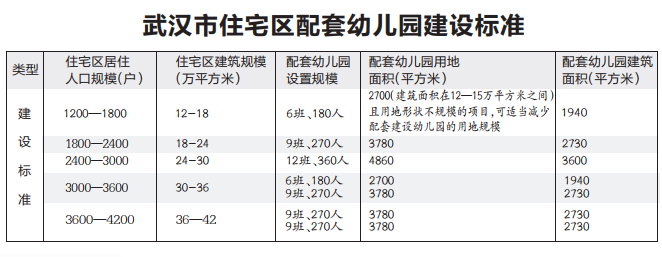 加快学前教育普及普惠发展,深入推进国家学前教育改革实验区工作,实施第三期学前教育行动计划。到2020年,确保全市学前三年教育毛入园率达到90%以上,全市公益普惠性幼儿园在园幼儿比例保持在80%以上。新改扩建公益普惠性幼儿园40所、新增学位1万个。继续推进全市住宅配套幼儿园建设、移交和使用情况的全面清理整顿工作。明确在本市行政区域内新建住宅区(农民个人自建住房除外)应当按照《市人民政府进一步加强住宅区配套幼儿园建设和管理的意见》和《武汉市住宅区配套幼儿园建设标准》配套建设幼儿园。具体标准如下表: