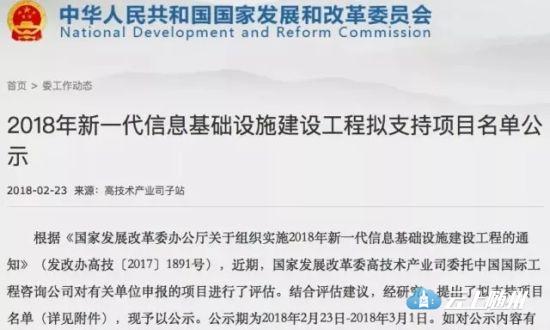 2月23日,国家发改委官网公布了《2018年新一代信息基础设施建设工程拟支持项目名单》。八个项目中,三大运营商5G规模组网建设及应用示范工程位列其中。