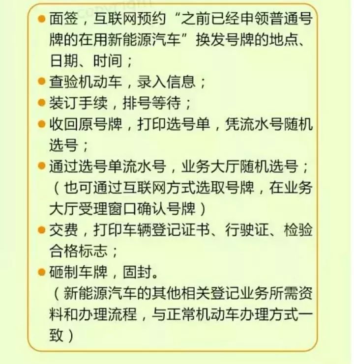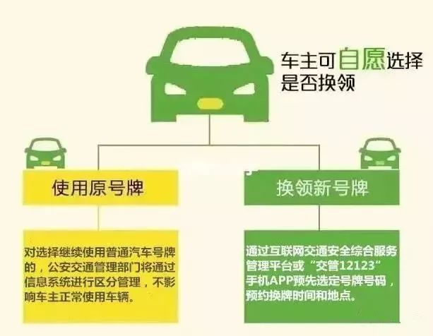 2、在用普通号牌新能源车更换新能源号牌:车主自愿选择是否换领新能源号牌,换领新能源号牌,只能通过互联网交通安全综合服务管理平台或“交管12123”预先选定号牌号码,预约换牌时间和地点